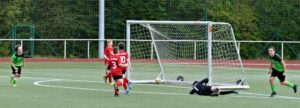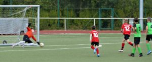 Gleich in der 8. Spielminute kam es in unserem Strafraum zu einem Getümmel, keiner konnte genau sehen, was passiert ist, kein Spieler ging zu Boden, aber der Pfiff des Schiedsrichters und die anschließende Geste waren eindeutig: Strafstoß gegen uns! Armer Tyler, der entschied sich sogar für die richtige Ecke, der Ball glitt nur knapp an ihm vorbei ins Tor, aber dann: Ein erneuter Pfiff des Schiedsrichters ertönte – Wiederholung, da sich die Spieler von Orlen anscheinend zu früh bewegt haben! Diesmal für Tyler leider unhaltbar landete der Ball nun regelkonform im Tor. 0:1 für Orlen, das wollte unsere Mannschaft so nicht auf sich sitzen lassen! Beflügelt von den Anfeuerungsrufen der kompletten C-Jugend des JFV von der Tribüne stürmte Benni nur eine Spielminute später vor das Tor der Gegner, um den Torwart herum, der zu weit herausgerückt war, und verwandelte zum verdienten 1:1.